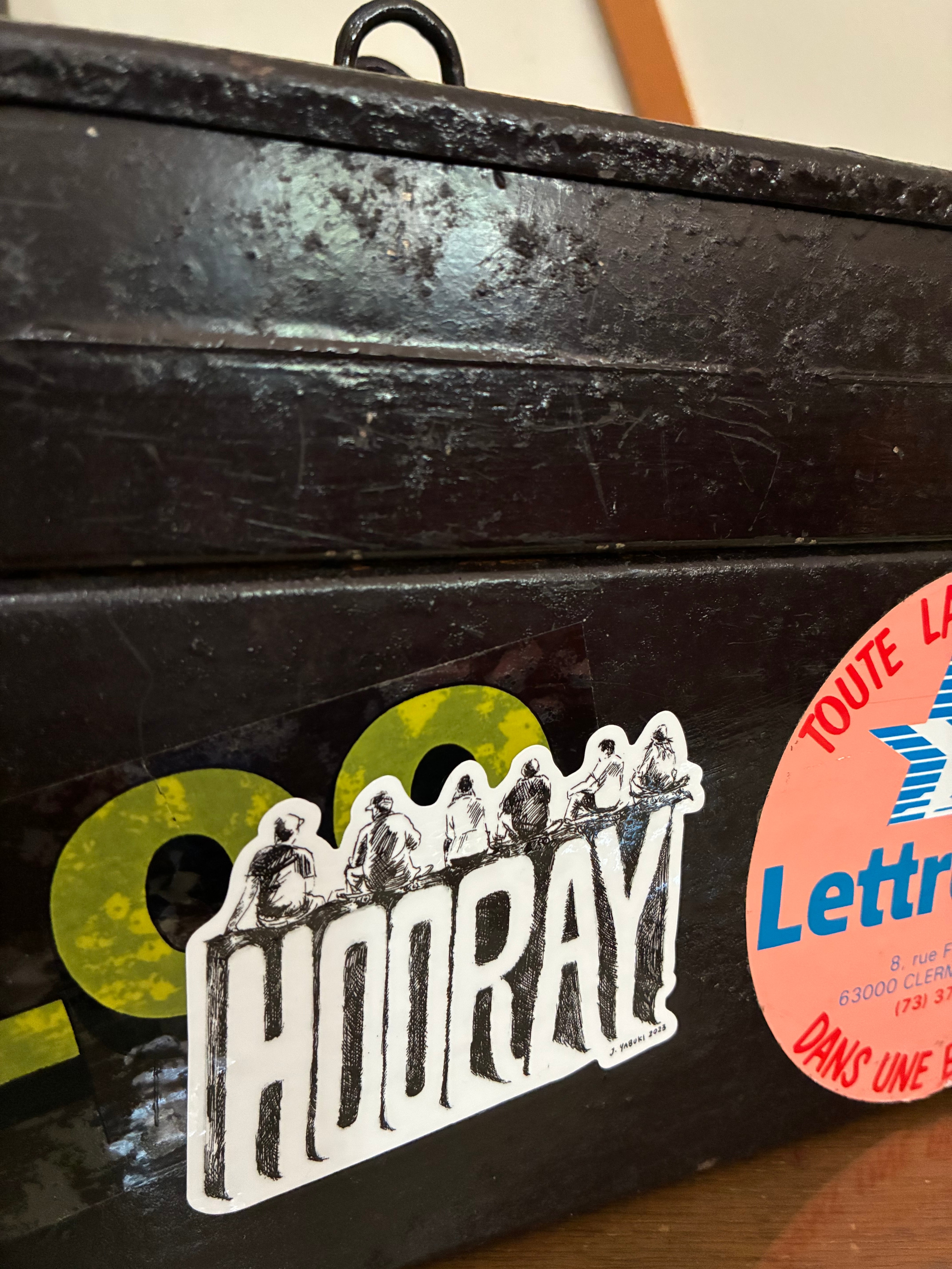 ◯HOORAY!の文字の上にスケーターが座っています。