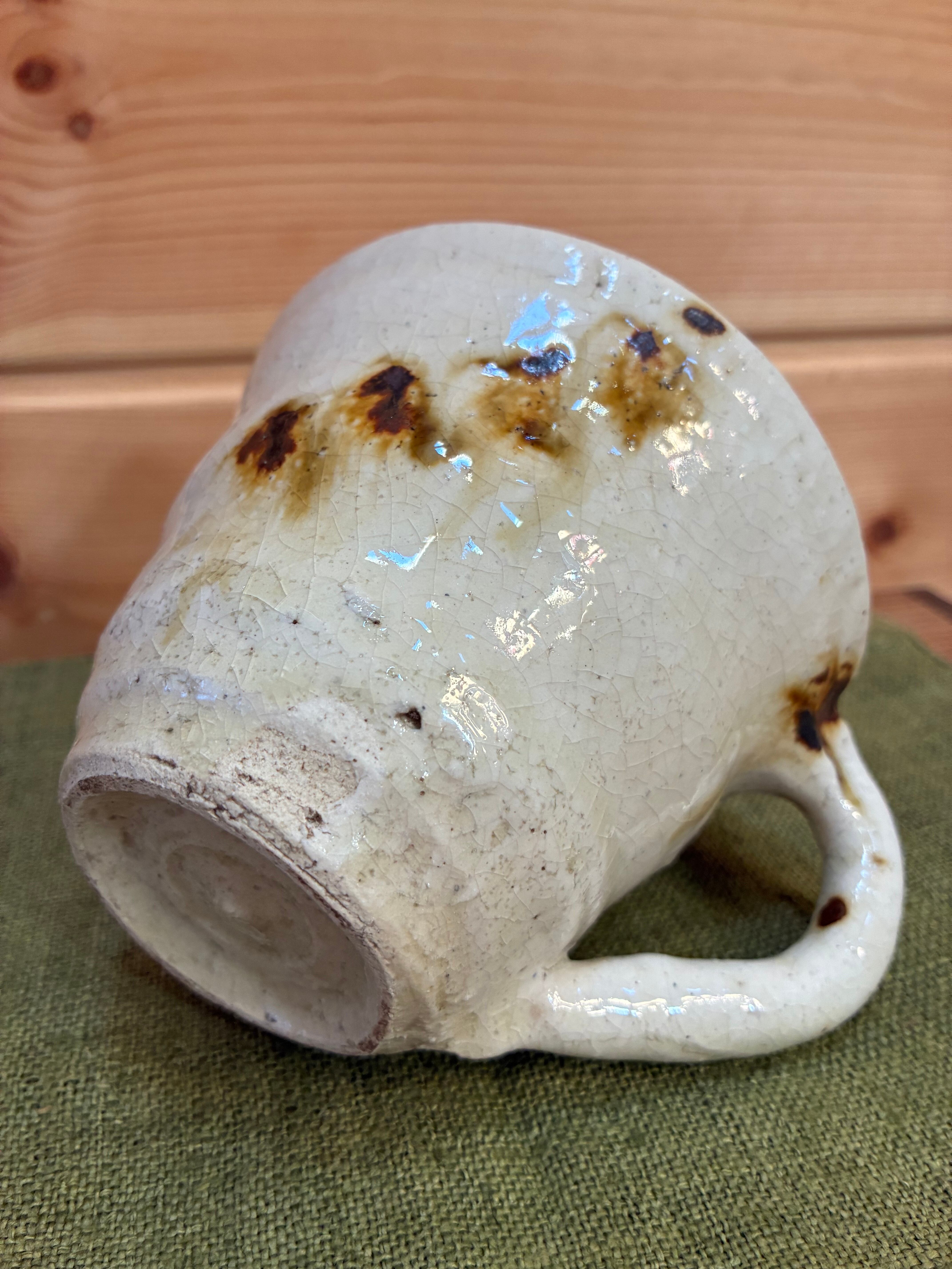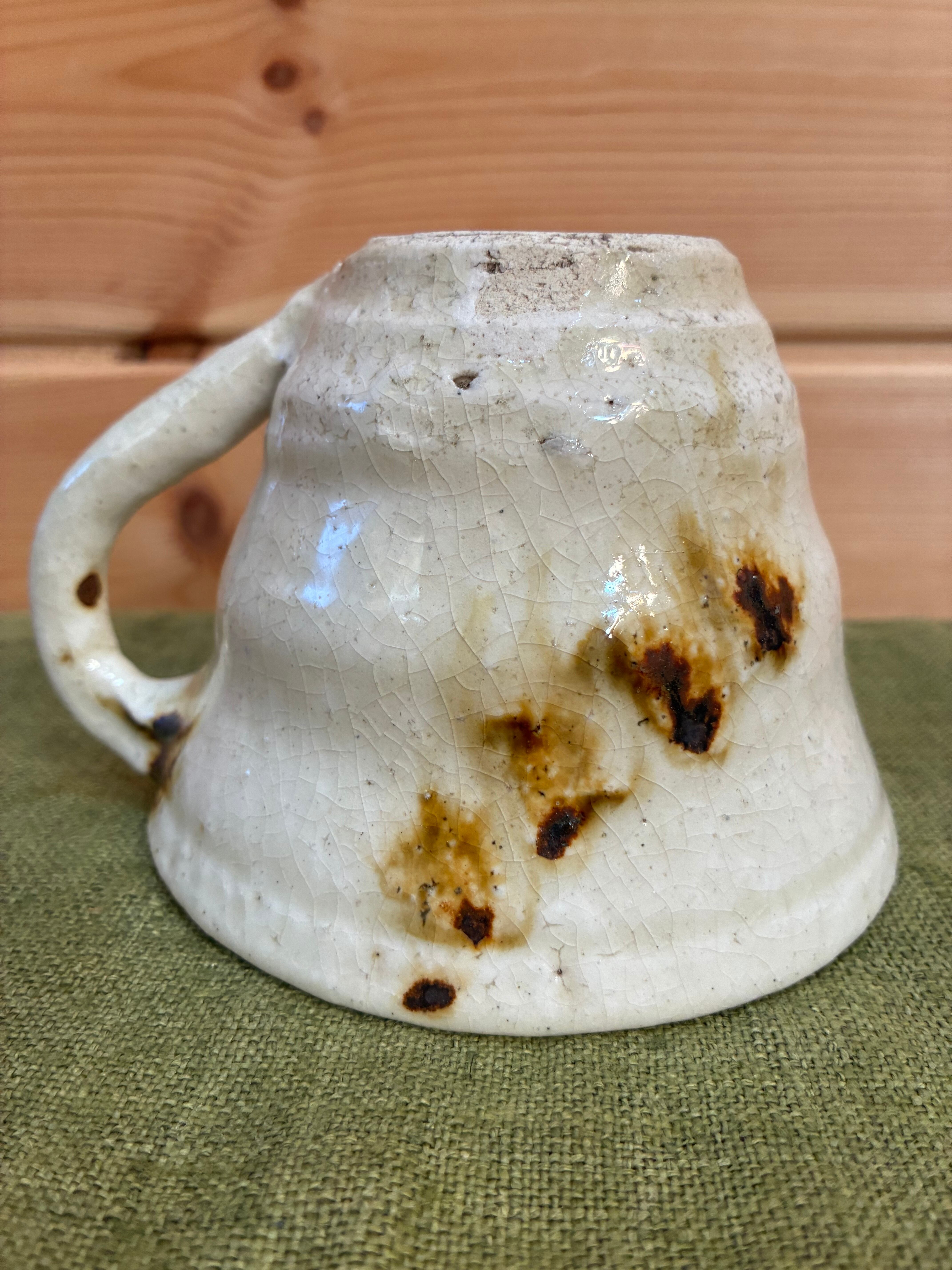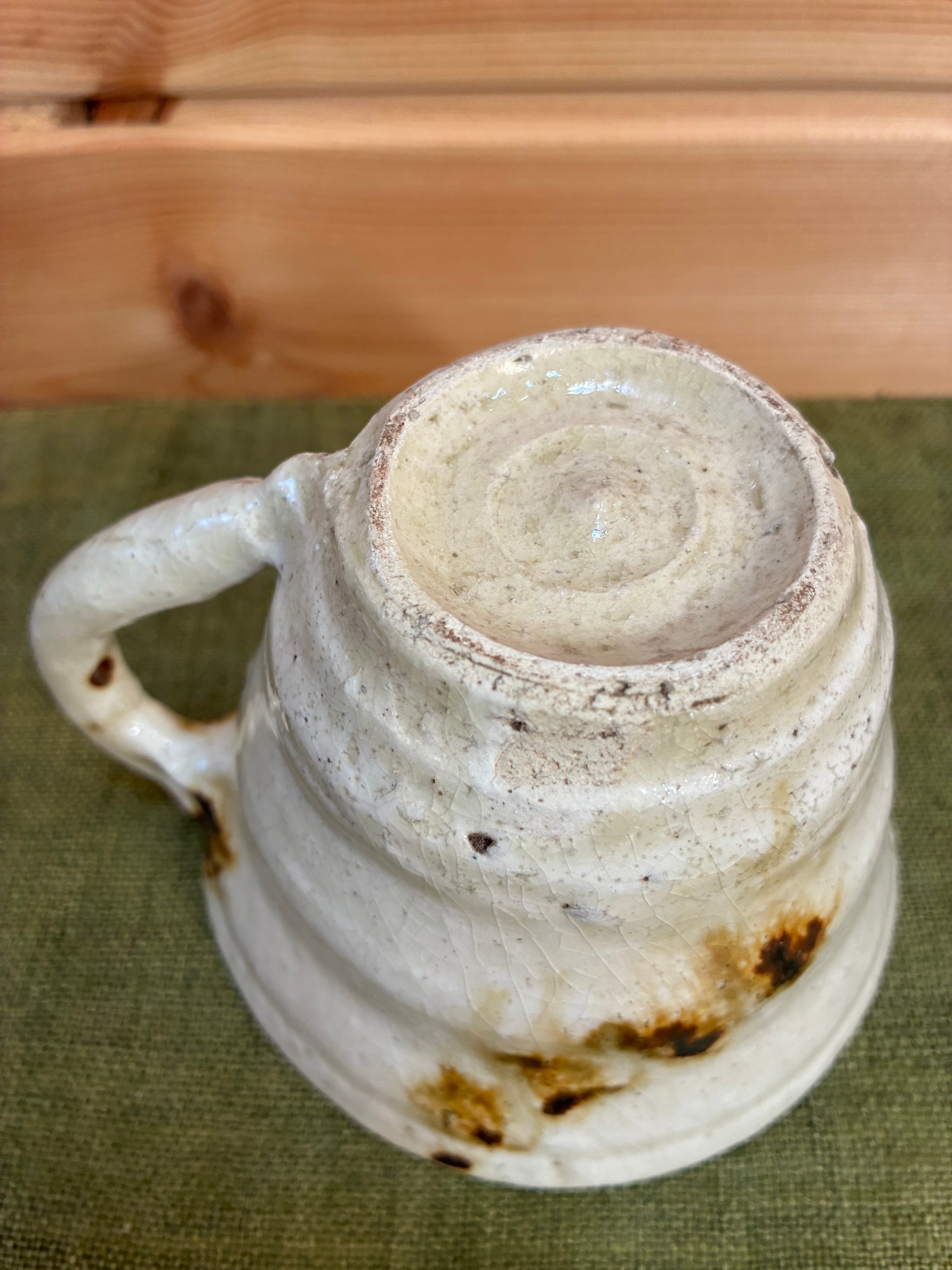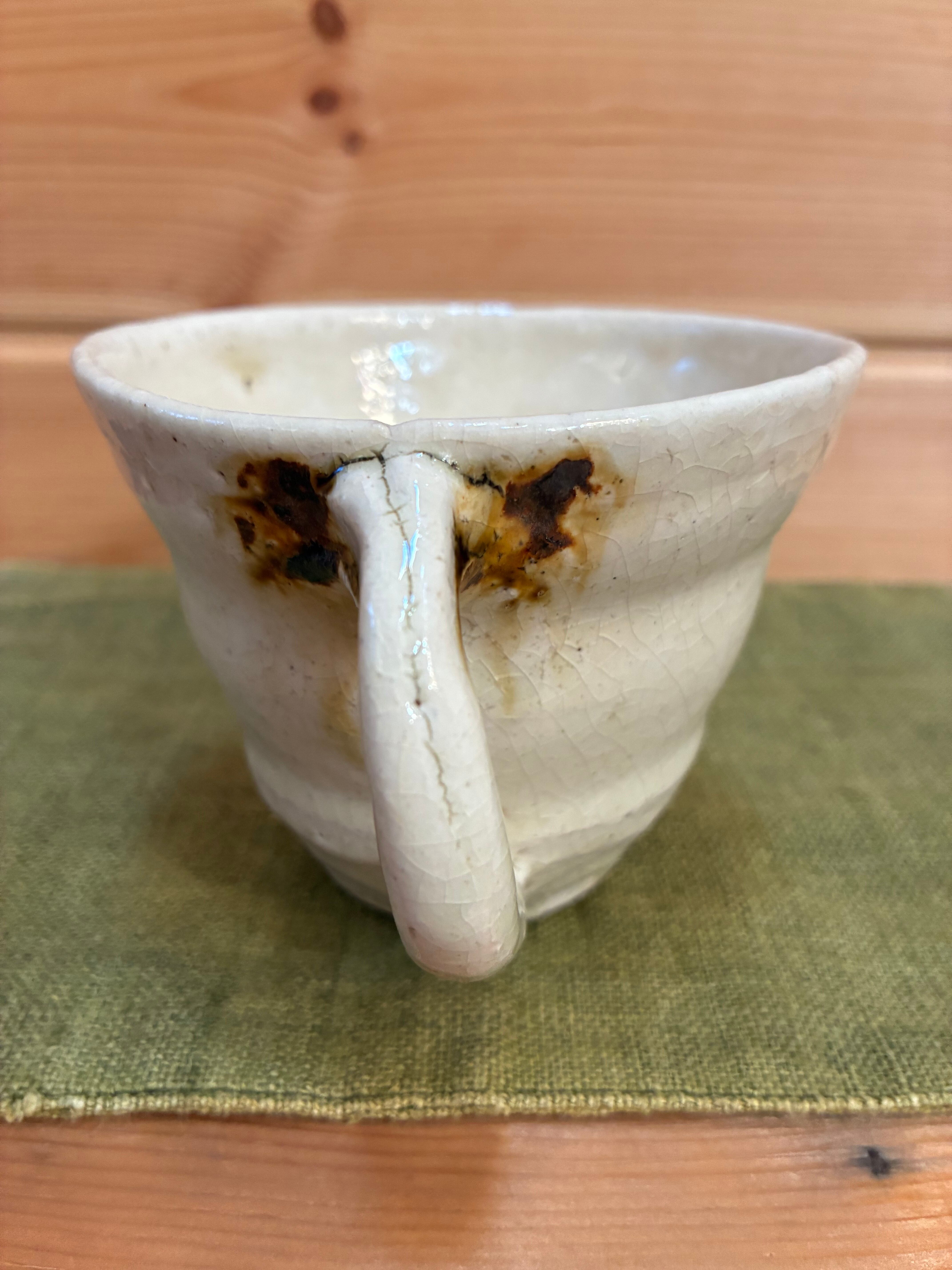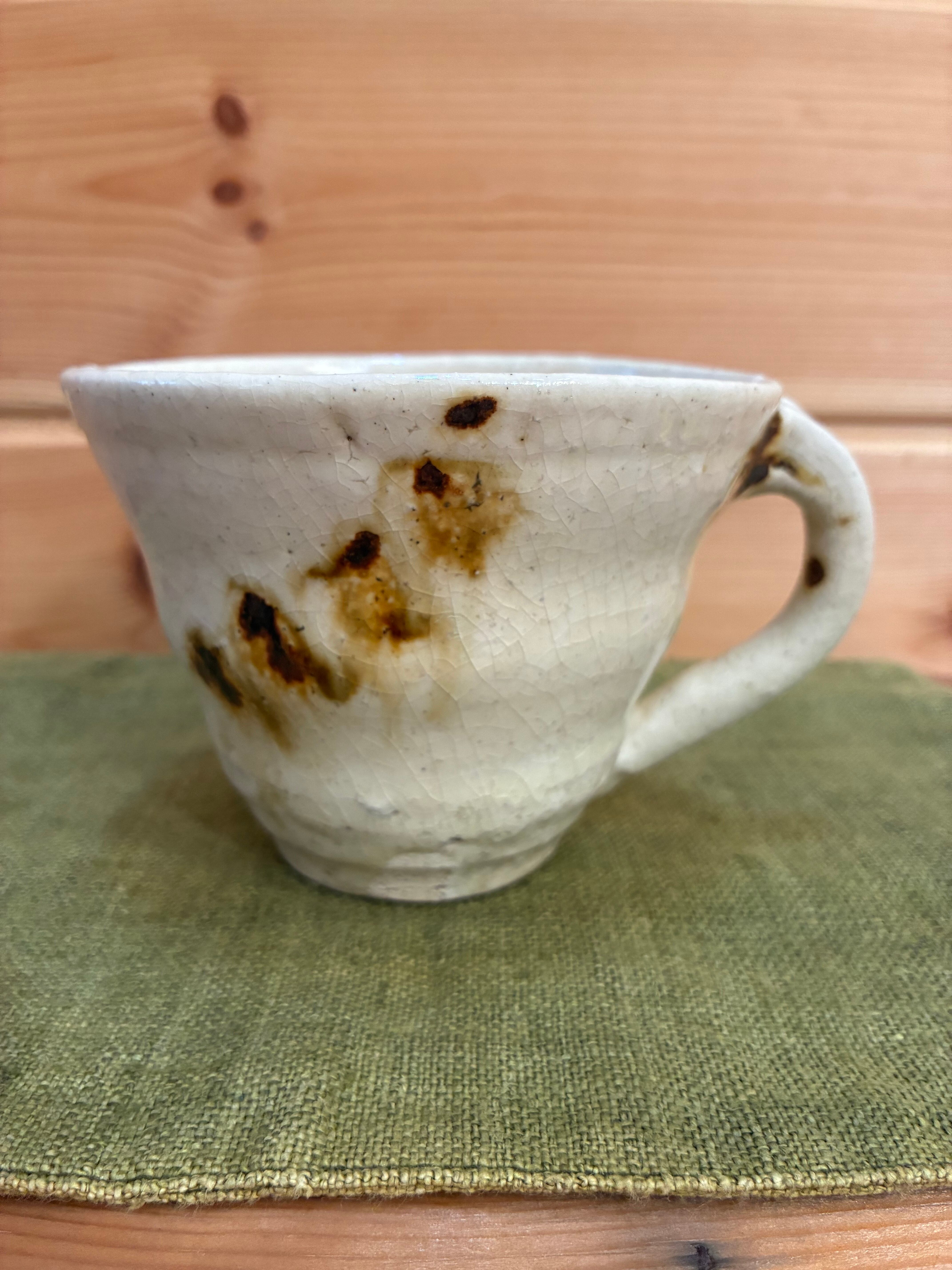 雄弁なフォルムと色彩に温かさを感じる能登さんの作品。自宅には、花瓶、大皿、小皿、片口、と数々のコレクションが集まり日々使ってまいりました。こちらのマグカップは、佇まいに一目惚れして仕入れました。ふたつとして同じものがないところにも心惹かれているのかも。作品は自宅用として贈り物として、いくつ求めたのか、思い出せないほどです。
